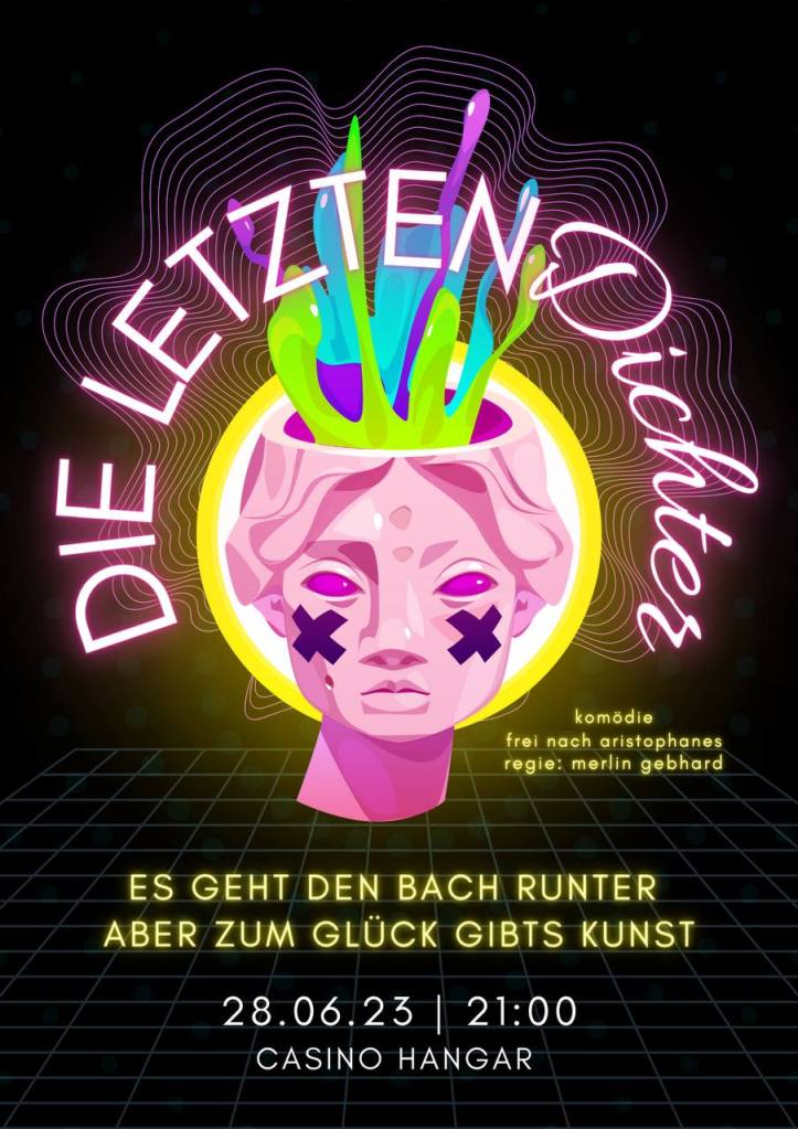 Die Götter haben sich aus dem Staub gemacht und alle guten Dichter sind tot. „Da muss ich ran!“ denkt sich Dionysos, Gott des Theaters. Zusammen mit seinem Kumpel Trygäos dem Winzer reist er in die Unterwelt. Dort findet er die Dichter Euripides und Aischylos. Einen darf er mitnehmen, nur wen?